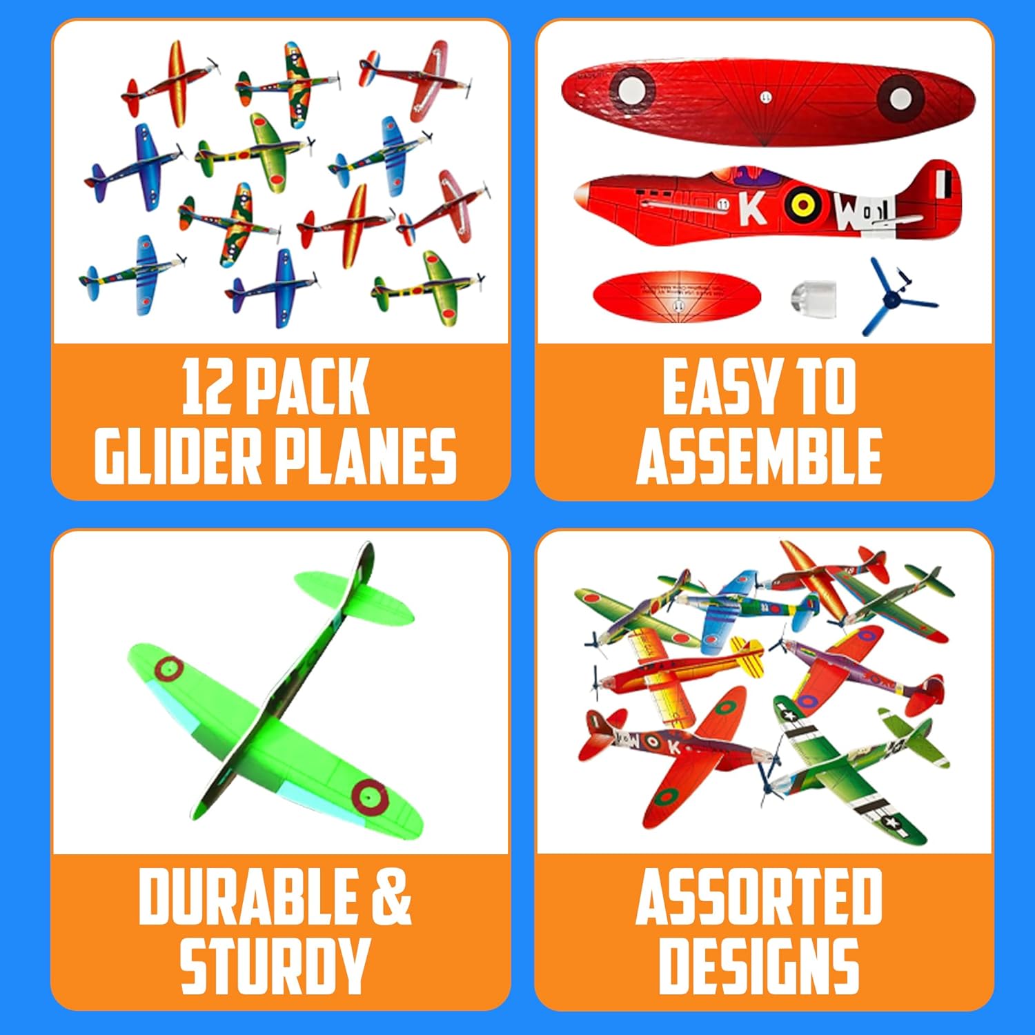 - 12 - 8 INCH GLIDER PLANES: Each order includes; 12 paper planes - 8 inch Glider Planes for Kids. This pack of gliders for kids features a variety of colors, made from lightweight foam material that really soar! Kids will love as they watch the propeller spin as the airplane glider flies through the air